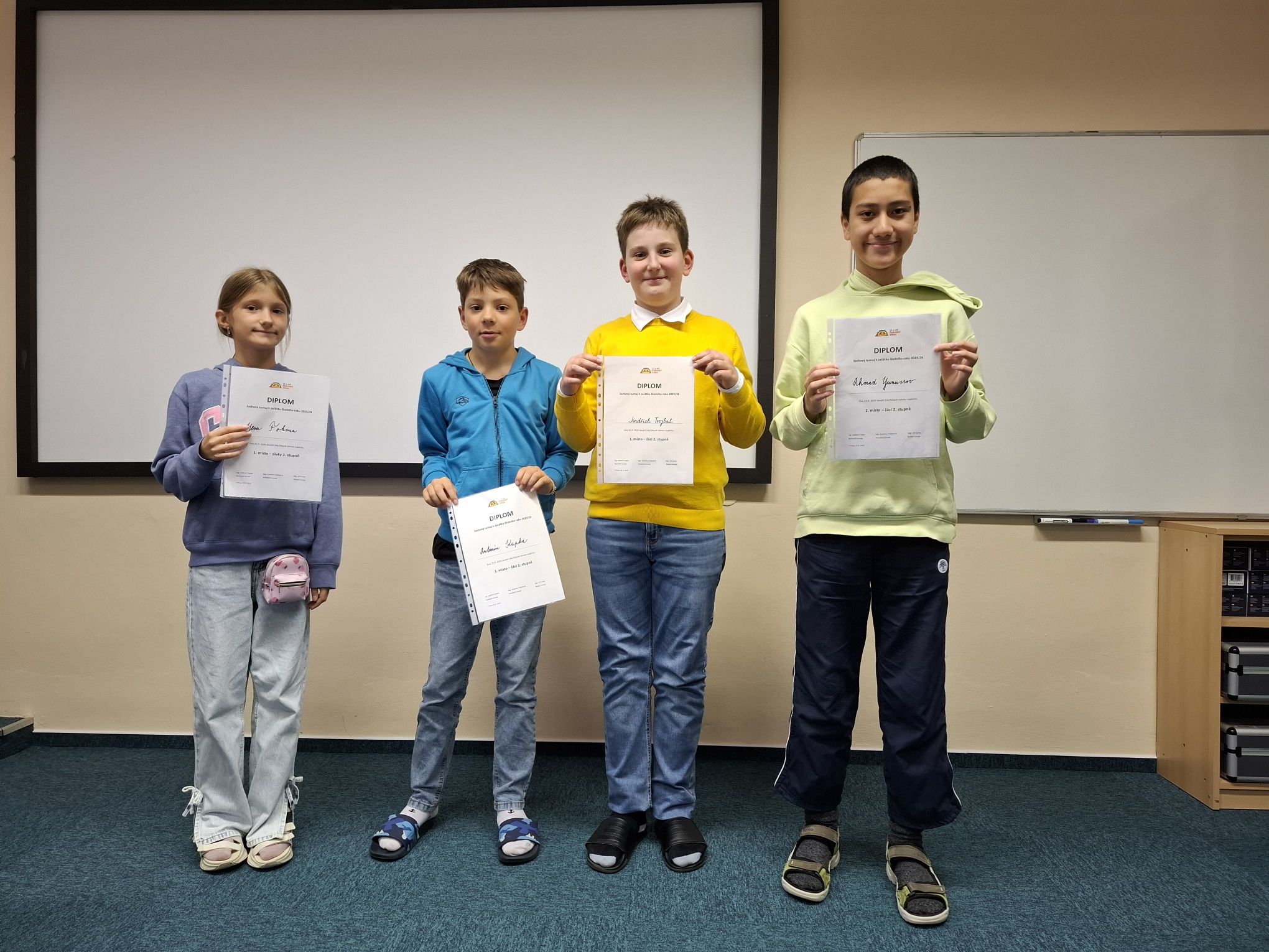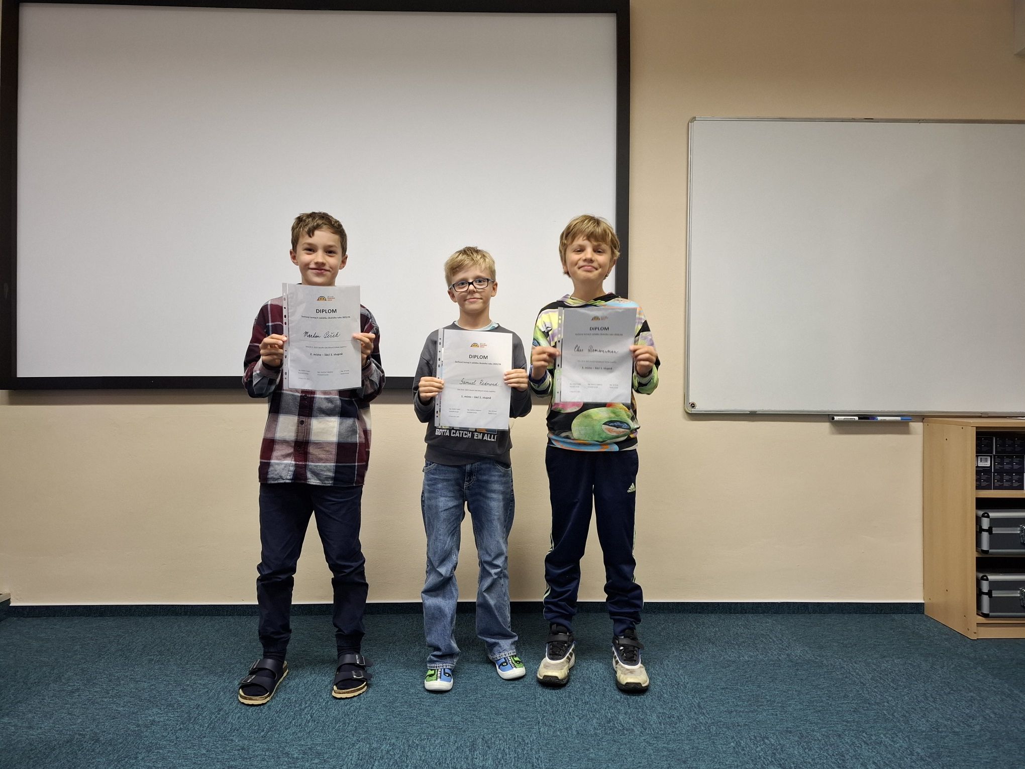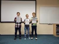 V turnaji žáků 1. stupně o 12 hráčích jasně zvítězil Samuel Redmond (3. C), který vyhrál 7 partií ze sedmi. Druhé místo získal Martin Pešek (4. C), ze třetího místa se radoval Elias Demmersman (4. B) – oba hráči dosáhli 5 bodů, ale Martin měl lepší pomocné hodnocení. Nejlepší (ale vlastně jedinou) dívkou byla Nela Štěchová, která se ziskem 3 bodů obsadila osmé místo.